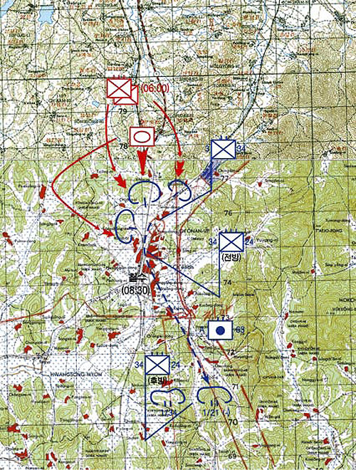 ±× ÈÄ 34¿¬´ë´Â »ç´ÜÀå ¸í·É¿¡ µû¶ó ´Ù½Ã ºÏ»óÇÏ·Á ÇßÁö¸¸ ŸÀ̹ÖÀ» ³õÄ¡°í õ¾È¿¡¼ ¹æ¾îÀüÀ» Ä¡·¶´Ù. õ¾È ÀüÅõ¿¡¼ ½ÅÀÓ ¿¬´ëÀå ¸¶Æ¾ ´ë·ÉÀº Àû ÀüÂ÷°¡ õ¾È ½Ã³»¿¡ ³ÀÔÇÑ È¥¶õ ¼Ó¿¡¼ Á÷Á¢ 2.36ÀÎÄ¡ ´ëÀüÂ÷·ÎÄϹ߻ç±â(=¹ÙÁÖÄ«)À» µé°í ÀüÂ÷¿Í ´ë°áÇÏ´Ù°¡ Àü»çÇß´Ù. ¿¬´ëÀå ¸¶Æ¾ ´ë·É¿¡°Ô´Â »çÈÄ¿¡ ¼öÈÆ½ÊÀÚÈÆÀåÀÌ Ãß¼µÇ¾ú´Ù. ÀÌ ±ÛÀ» ¾²¸é¼ ÅØ½ºÆ®¸¦ ´Ù½Ã È®ÀÎÇÒ ¼ö´Â ¾ø¾úÁö¸¸, ¾î´À ÀÚ·á¿¡¼Àΰ¡ ÁÖº¯¿¡ 2.36ÀÎÄ¡ ·ÎÄÏÀ» »ç¿ëÇÒ ÁÙ ¾Æ´Â »ç¶÷ÀÌ ¾Æ¹«µµ ¾ø¾î¼ ¿¬´ëÀåÀÌ Á÷Á¢ ³ª¼¹´ø °ÍÀ̶ó°í º» °Í °°´Ù. 34¿¬´ë´Â ÀüÂ÷ºÎ´ë¸¦ µ¿¹ÝÇÑ »ç´Ü±Þ º´·ÂÀ» ¸Â¾Æ ÇÏ·í¹ã Á¤µµ õ¾È¿¡¼ ¹öƼ´Ù°¡ Å« ÇÇÇØ¸¦ ÀÔ°í °á±¹ Áß°úºÎÀûÀ¸·Î ö¼öÇß´Ù.
