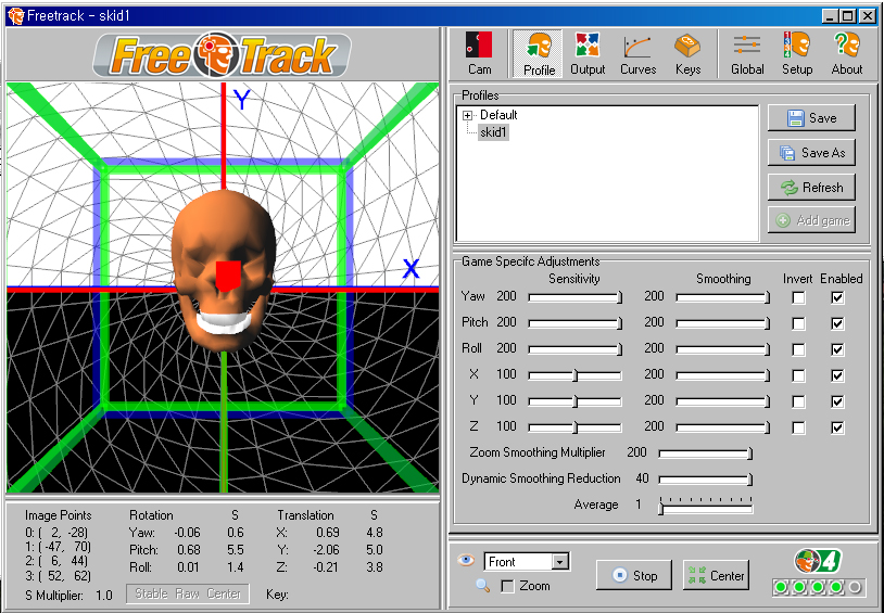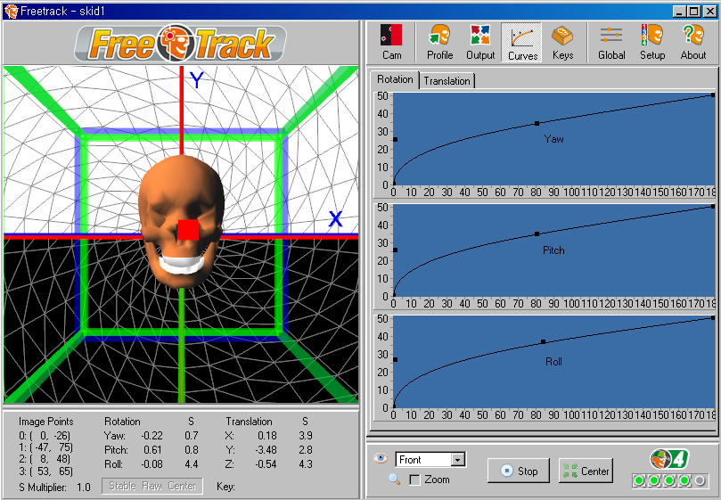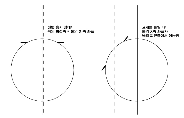 µÎ °³ÀÇ Æ÷ÀÎÅÍ·Î °î¼±ÀÇ ±¼°îÀ» º¯È½ÃŰ´Â ¹æ¹ýÀ¸·Î °ªÀ» Áִµ¥, °£´ÜÈ÷ ¼³¸íÇϸé À§ ±×¸²Àº ¼¾ÅÍ ºÎ±Ù¿¡¼´Â ³·Àº °¨µµ¸¦ ÁÖ¾î¼ Á¤¸éÀ» º¼ ¶§ ½Ã¼±Ã³¸®¸¦ ¾ÈÁ¤ÀûÀ¸·Î ÇÏ°í °í°³¸¦ µ¹¸±¼ö·Ï º¯ÈÀ²ÀÌ ³ô¾ÆÁöµµ·Ï ¼³Á¤ÇÑ °ÍÀÌ´Ù. °³ÀÎ ÃëÇâ¿¡ µû¶ó ´Ù¸£°ÚÁö¸¸ ¾Æ¸¶ ¸¹Àº °æ¿ì¿¡ ÀÌ¿Í ºñ½ÁÇÑ ¼³Á¤À» ¼±È£ÇÏ½Ç °ÍÀ¸·Î »ý°¢µÈ´Ù. Rotation¿¡¼´Â ¿ä¿ì, ÇÇÄ¡, ·Ñ 3°³ÃàÀ» ¼³Á¤Çϰí Translation¿¡¼´Â X, Y, Z 3°³ÃàÀ» ¼³Á¤ÇÑ´Ù. ¼³Á¤¹æ¹ýÀº ¸ðµÎ °°´Ù.