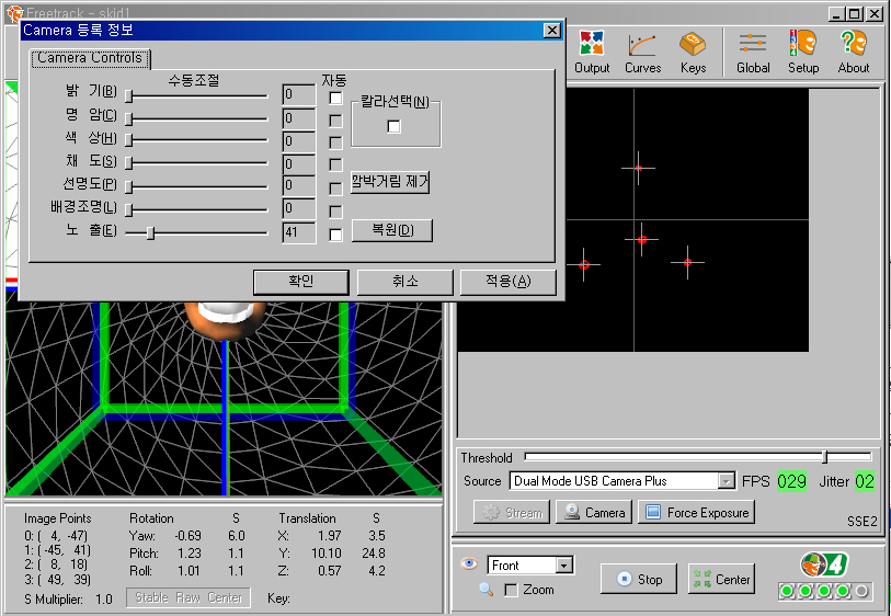 Ä«¸Þ¶ó ¼³Á¤À» ¸¶ÃÆÀ¸¸é âÀ» ´Ý°í ¸ÞÀΠâÀÇ Threshold°ªÀ» Á¶ÀýÇÑ´Ù. ¿ÞÂÊÀÌ ¹à°Ô, ¿À¸¥ÂÊ¿¡ ¾îµÓ°ÔÀÌ´Ù. ¿À¸¥ÂÊÀ¸·Î ³Ê¹« ¿òÁ÷ÀÌ¸é Æ÷ÀÎÅͰ¡ »ç¶óÁ® ¹ö¸®°í, ¿ÞÂÊÀ¸·Î ³Ê¹« ¿òÁ÷ÀÌ¸é Æ÷ÀÎÅͰ¡ ³Ê¹« Ä¿Áö°Å³ª ÁÖº¯ÀÇ ´Ù¸¥ ºûÀÌ ÀνĵȴÙ. ÀÌ ¶§ ³ëÃâ°ª Á¶ÀýÀ¸·Î ´Ù½Ã µ¹¾Æ°¡·Á ÇÏÁö ¸»°í ±×³É Threshold °ªÀ» Á¶Á¤ÇÑ´Ù. ThresholdÀ» ¿ÞÂÊ¿¡ ³õÀ» ¼ö·Ï Æ÷ÀÎÅͰ¡ ¼±¸íÇØÁöÁö¸¸ Æ÷ÀÎÅͰ¡ Áö³ªÄ¡°Ô Å©°Ô ³ª¿À¸é Æ÷ÀÎÅÍ ÁÂÇ¥°¡ ÁßøµÇ´Â °£¼·ÀÌ ¸¹¾ÆÁú ¼ö ÀÖ°í Æ÷ÀÎÅͰ¡ ¿òÁ÷ÀÌÁö ¾Ê´Âµ¥µµ Æ÷ÀÎÅÍ ³»¿¡¼ ÁÂÇ¥°ªÀÌ ¿òÁ÷ÀÌ´Â Çö»óÀÌ ¹ß»ýÇÒ ¼ö ÀÖ´Ù. Æ÷ÀÎÅÍ ÀνÄÀÌ È®½ÇÈ÷ µÇ´Â Çѵµ ³»¿¡¼ °¡±ÞÀû ¿À¸¥ÂÊÀ¸·Î Àâ¾ÆÁÖ´Â °ÍÀÌ ÁÁ´Ù. ¿©±â±îÁö ÇÏ¸é Æ÷ÀÎÅÍ ÀÎ½Ä ÀÛ¾÷Àº ³¡³´Ù.