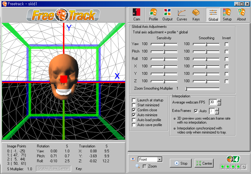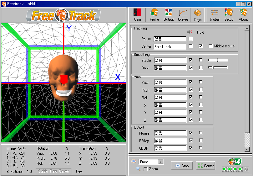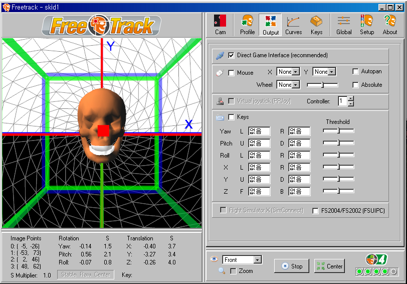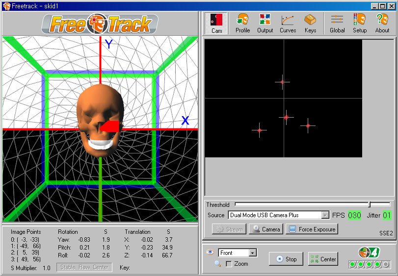 °¡Àå ±âº» ȸéÀÌ´Ù. ¼³Á¤ ¿øÄ¢À» ¸»ÇÏÀÚ¸é, ¿À¸¥ÂÊ Ã¢ÀÇ »¡°£»ö Æ÷ÀÎÅ͵éÀÌ LED·Î¼ ´Ù¸¥ ½ÅÈ£°¡ ¾ÈÀâÈ÷°í Àú ³× °³ÀÇ µµÆ®¸¸ ȸ鿡 º¸À̵µ·Ï Çϰí, ¸Ó¸®¸¦ ¿òÁ÷ÀÌ´Â °¢µµ¿¡ »ó°ü¾øÀÌ ÀÏÁ¤ÇÏ°Ô µµÆ®°¡ ÀâÈ÷µµ·Ï ÇÏ´Â °ÍÀÌ ¸ñÇ¥ÀÌ´Ù. FPS´Â ÃÖ´ë°ªÀÎ 30, Jitter(½ÅÈ£ ¿À·ù·Î ÀÎÇÑ ¶³¸²)´Â ÃÖ¼Ò°ªÀÎ 1ÀÌ ³ª¿À´Â°Ô ÀÌ»óÀûÀÌ´Ù. ¿À¸¥ÂÊ ¾Æ·¡ÀÇ ÆÄ¶õ»ö ºÒºû ³× °³´Â °¢ Æ÷ÀÎÅ͸¦ Á¤»óÀûÀ¸·Î ÀνÄÇÑ´Ù´Â °ÍÀ» ³ªÅ¸³½´Ù. ÀÌ ºÒ ³× °³°¡ ¸ðµÎ ÆÄ¶õ»öÀ̶ó¾ß Çϰí, ÀÌ°Ô »¡°£»öÀ¸·Î º¯Çϰųª °¹¼ö°¡ ÁÙ¾îµé¸é Á¦´ë·Î ÀνÄÀÌ ¾ÈµÇ°í ÀÖ´Â °ÍÀÌ´Ù. ±×·¯¸é °ÔÀÓ¿¡¼ ½Ã¾ß º¯°æÀÌ ²÷±â°Å³ª ¸ØÃá´Ù. ºñÇà Áß ÀÌ·± ²÷±èÇö»óÀÌ »ý±â¸é »ç¿ëÇϱ⿡ Â¥Áõ³ª¹Ç·Î À¢¸¸ÇÑ °¡´ÉÇÑ ÀÚ¼¼ ¹üÀ§ ³»¿¡¼ ÀνÄÀ² 99%°¡ µÇµµ·Ï Àâ´Â °ÍÀ» ¸ñÇ¥·Î ÇØ¾ß ÇÑ´Ù. ¹°·Ð °¡´ÉÇϴϱî ȨÁö±â°¡ ¿½ÉÈ÷ ÇÁ¸®Æ®·¢ ¸®ºä¸¦ ¾²°í ÀÖ´Â °ÍÀÌ´Ù. ¾ÕÀ¸·ÎÀÇ ¼³Á¤ ¸Þ´º ¼³¸íµé¿¡¼, Ȥ½Ã ±â´É¿¡ ´ëÇÑ ¼³¸íÀ» ¼±¶æ ÀÌÇØÇϱâ Èûµé°Å³ª ÀÏÀÏÀÌ ¼³Á¤Çϱ⠱ÍÂú´Ù¸é °£´ÜÈ÷ »ðÈ¿¡ ³ª¿Â ȨÁö±â ¼³Á¤¸¦ µû¶ó¼ ÇØº¸½Ã´Â °Íµµ ÁÁ°Ú´Ù. ÀϺΠ¼³Á¤ ±â´ÉÀº ¼·ÎÀÇ ¼³Á¤ÀÌ »óÈ£ÀÛ¿ëÀ» Çϱ⵵ ÇÑ´Ù.