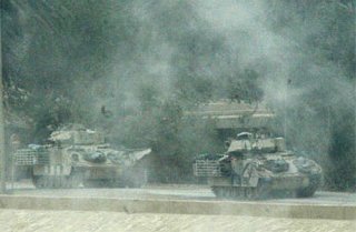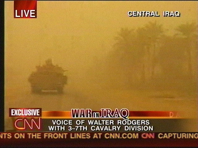 91³âÀÇ °ÉÇÁÀü°ú´Â ´Þ¸®, 2003³â À̶óÅ©Àü¿¡¼´Â ¹æ¼Û ±âÀÚµéÀÌ À§¼º ¿µ»óÆùÀ» µé°í ÀüÅõ¿¡ ¶Ù¾îµé¾ú´Ù. ±×¸¦ ÅëÇØ Ä«½ºÅÍ À屺ÀÌ À̲ø´ø, ±×¸®°í ÇÒ ¹«¾î Áß·ÉÀÌ À̲ø´ø ±× 7 ±âº´´ë°¡ »ç¸·À» ÁúÁÖÇÏ´Â °ÍÀ» Áö±¸ ¹Ý´ëÆí¿¡¼ ½Ç½Ã°£À¸·Î º¼ ¼ö ÀÖ¾ú´Ù. 3-7 ±âº´ ´ë´ë¿Í ÇØº´ 1¿øÁ¤±º¿¡ ÀÓº£µåµÈ ±âÀÚµéÀº ¹Ù±×´Ùµå¿¡ À̸¦ ¶§±îÁö ÇÏ·ç¿¡µµ ¿©·¯ ¹øÀÇ ±³ÀüÀ» Á÷Á¢ °ÞÀ¸¸é¼ À̸¦ º¸µµÇß´Ù. ¹Ù±×´Ùµå °ø½À ½Ã¿¡´Â ¹Ì±º±â¿¡¼ ÅõÇÏÇÑ ÆøÅºµéÀÌ Ä«¸Þ¶ó¿¡ ¶È¶ÈÈ÷ ÀâÇû´Ù. ±×¸®°í ¹Ù±×´Ùµå ħ°øÀ» ´ëºñÇØ ¹Ù±×´Ùµå °÷°÷¿¡ ¼³Ä¡µÇ¾î ÀÖ´ø ¼¹æ ¾ð·Ð»çÀÇ Ä«¸Þ¶óµéÀº °á±¹ ¹Ù±×´Ùµå ½Ã°¡ÀüÀ», ±×¸®°í Ƽ±×¸®½º ° Á¦¹æ¿¡¼ ¹ú¾îÁö´ø °øÈ±¹ ¼öºñ´ë¿ø°ú ºê·¡µé¸® °£ÀÇ ÀüÅõ¸¦ »ýÁß°èÇϱ⿡ À̸£·¶´Ù. RPG°¡ ³¯¾Æ°¡°í, ºê·¡µé¸®ÀÇ Ã¼ÀΰÇÀÌ ´ëÀÀ »ç°ÝÀ» Çϰí, ÀüÅõ¸¦ Æ÷±âÇÏ°í µµ¸ÁÄ¡´ø °øÈ±¹ ¼öºñ´ë ´ë¿ø Áß ÇѸíÀº ÂüÈ£¿¡¼ ¶Ù¾î³ª¿À´Ù°¡ ÃѰÝÀ» ¹Þ°í ¾²·¯Áö´Â Àå¸éÀÌ »ý»ýÇÏ°Ô Áö±¸ ¹Ý´ëÆí±îÁö ½Ç½Ã°£À¸·Î ÀüÇØÁ³´Ù. (ÀÌÈÄ ±¹³»ÀÇ ´º½º º¸µµ¿¡¼´Â ÀÌÀå¸éÀÌ ÆíÁýµÇ¾ú´Ù) ȨÁö±â´Â TV¸¦ ÅëÇØ Áö±¸ ¹Ý´ëÆí¿¡¼ ¹ú¾îÁö´Â ÀüÀï°ú ÀüÅõ, ±×¸®°í ÀüÀïÅÍ¿¡¼ ÁøÂ¥ »ç¶÷ÀÌ Á׾°¡´Â °ÍÀ» »ý¹æ¼ÛÀ¸·Î ÁöÄѺ¸¾Ò´Ù. TV¸¦ ÅëÇØ¼ º¸´Â °ÍÀ̾úÀ½¿¡µµ ºÒ±¸Çϰí, ±×µ¿¾ÈÀÇ °£Á¢ üÇèµé°ú´Â ÀüÇô ´Ù¸¥ ¼º°ÝÀÇ Ãæ°ÝÀ» ¹Þ¾Ò´Ù. °£Á¢ üÇèÀ¸·Î¼´Â °¡Àå ±Ø´ÜÀûÀÎ °æ¿ì¶ó°í ÇÒ ¸¸Çß´Ù.