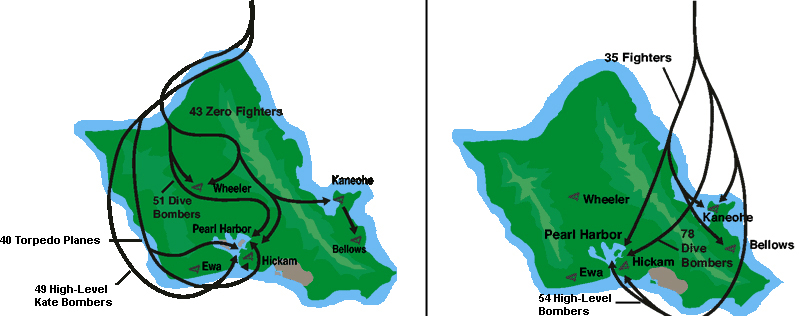 È÷į(Hickam) ±âÁö¿¡¼ Æø°Ý±âµéÀÌ ÆÄ±«µÇ¾î ³ª±¸¸ð(Nagumo)ÀÇ Ç׸𰡠ÇÇÇØ ¾øÀÌ Å»ÃâÇÒ °¡´É¼ºÀÌ Å©°Ô ´Ã¾ú´Ù. ÇÏÁö¸¸ ÀϺ» Ç×°ø±âµéÀÌ ÀÓ¹«¸¦ ¿Ï¼öÇÒ ¼ö ÀÖÀ»Áö ¿©ºÎ´Â ¹Ì±¹ ¿ä°Ý±âµéÀÇ ÀúÇ×À» ¿¹¹æÇÏ´Â °Í¿¡ ´Þ·ÁÀÖ¾ú´Ù. ¿À¾ÆÈÄ(Oahu) ¼¶ Áß¾Ó¿¡ ÀÖ´Â ÈÙ·¯(Wheeler) ±âÁö¿¡ »ç·ÉºÎ¿Í ÁÖ·ÂÀÌ ÁÖµÐÇÑ Á¦14 ¿ä°ÝºñÇà´ÜÀÌ ÇÏ¿ÍÀÌ »ó°øÀ» ÅëÁ¦ÇÏ´Â ÀüÅõ±â ÁöÈÖ Ã¥ÀÓÀ» ¸Ã°í ÀÖ¾ú´Ù. ÇÏ¿öµå µ¥À̺ø½¼(Howard Davidson) ÁØÀåÀÌ ÁöÈÖÇÏ´Â ÀÌ ºñÇà´Ü¿¡´Â »ó´ëÀûÀ¸·Î ½ÅÇüÀÎ 99´ëÀÇ P-40, 39´ëÀÇ ±¸Çü P-36, ±×¸®°í °¢Á¾ ±¸Çü±âµéÀÌ ÀÖ¾ú´Ù. ÀÌ ÀüÅõ±âµéÀº ¹«ÀåÀ» ÇÏÁö ¾Ê¾Ò°í Åë»óÀûÀÎ °æ°è »óÅ¿¡ ÀÖ¾ú´Âµ¥, ÀÌ´Â ÀüÅõ Áغñ ż¼¸¦ °®Ãß·Á¸é 4½Ã°£ÀÌ °É¸°´Ù´Â ¶æÀ̾ú´Ù. µ¥À̺ø½¼ ÁØÀå ÈÖÇÏÀÎ Á¦44°ú Á¦47 2°³ ´ë´ë´Â »ç°Ý ÈÆ·ÃÀ» À§ÇØ ÇÒ·¹ÀÌ¿Í(Haleiwa) ¹× º§·Î¿ì½º(Bellows) ±âÁö¿¡ Àӽ÷ΠÀü°³Çß´Ù.